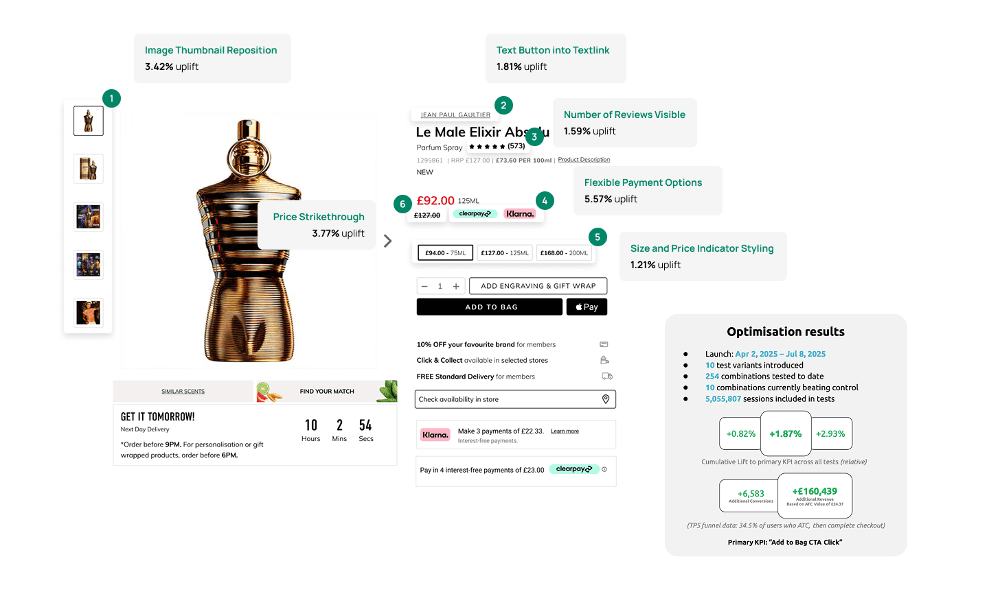 Using ContentSquare’s Zoning Analysis, I identified that users were highly engaged with the flexible payment options, which also correlated with strong conversion rates. This insight led me to reposition these options above the fold to increase visibility. I also collaborated with EvolvAI and used competitor analysis to inform variant ideas. Additionally, insights gathered from a store visit revealed that customers were confused about pricing differences between online and in-store promotions. This feedback inspired the introduction of a price strike-through format online (instead of “Save £££”) to provide clearer price transparency and align expectations across channels.